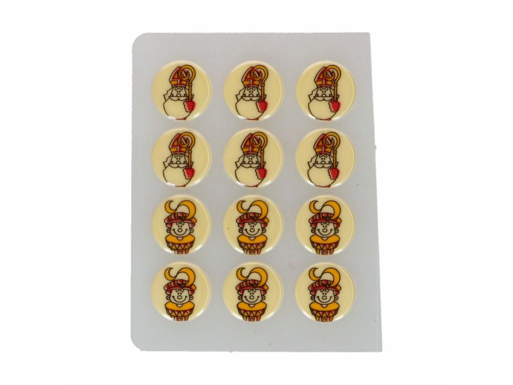 Čoko dekorácia Mikuláš 12ks. Zloženie: cukor; kakaové maslo; sušené MLIEKO odtučnené; sušené MLIEKO (bezvodé); emulgátor: E322 (slnečnica); kakaový prášok so zníženým obsahom tuku; prírodná vanilková aróma; farbivo: E172, E102, E101, E120. Môže obsahovať: SÓJOVÉ BÔBY. Alergény sú v zložení ZVÝRAZNENÉ. Distribútor: NewCakes BV, Bruynvisweg 3, 1531 AX, Wormer, Holandsko. Návod na použitie / dávkovanie: Podlľa potreby / receptúry. Na zdobenie koláčov, zákuskov a tort.. Skladovanie: Teplota: min. 12.0°C, max. 20.0°C. Skladovanie po otvorení: Teplota: min. 12.0°C, max. 20.0°C. Identifikácia výrobnej dávky: . Minimálna trvanlivosť do: viď obal