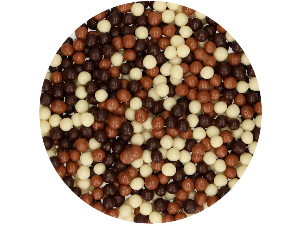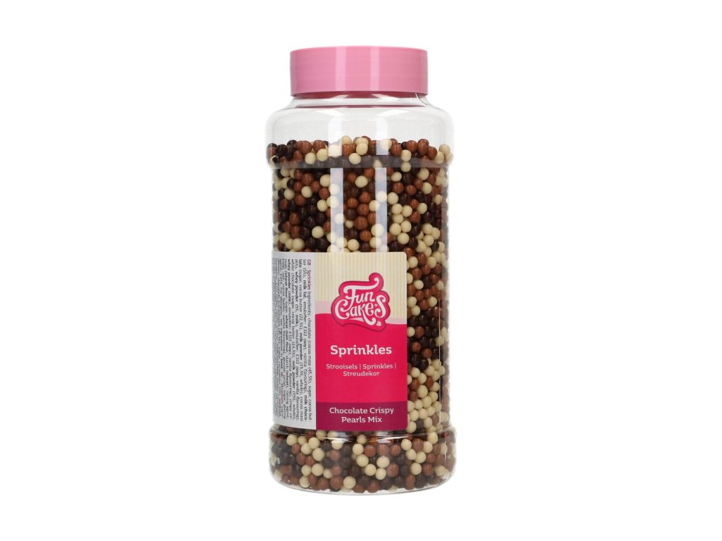 #zloženie#FC posyp Chocolate Crispy Pearls Mix 500g. Posyp, na zdobenie koláčov, zákuskov a tort. Zloženie: Čokoláda (kakaová hmota (46 %), cukor, kakaové maslo (5 %), MLIEČNY tuk, emulgátor: E322 (SÓJA), vanilková aróma); MLIEČNA čokoláda (cukor, kakaové maslo (23 %), sušené PLNOTUČNÉ mlieko (16 %), kakaová hmota (6 %), sušená SRVÁTKA (5 %), emulgátor: E322 (SÓJA), vanilková aróma); biela čokoláda (cukor, kakaové maslo (25 %), sušené PLNOTUČNÉ mlieko (15 %), sušená SRVÁTKA, emulgátor: E322 (SÓJA), vanilková aróma); chrumkavé cereálie (pšeničná múka, cukor, PŠENIČNÁ SLADOVÁ múka, PŠENIČNÝ škrob, kypriaca látka: E500, soľ, kakaové maslo, vanilková aróma, glukózový sirup); cukor; povlaková látka: E414. Alergény sú v zložení ZVÝRAZNENÉ. Distribútor: NewCakes BV, Bruynvisweg 3, 1531 AX, Wormer, Holandsko. Návod na použitie / dávkovanie: Na zdobenie koláčov, zákuskov a tort.. . Skladovanie: Teplota: min. 15.0°C, max. 20.0°C. Skladujte na suchom mieste. Identifikácia výrobnej dávky: viď obal. Minimálna trvanlivosť do: viď obal. Hmotnosť: 500 g. Výživové údaje na 100 g: Energia 1680 kJ/399kcal. Tuky 1,1 g; z toho nasýtené mastné kyseliny 0,4 g. Sacharidy 96 g; z toho cukry 85 g. Vláknina <0,5 g. Bielkoviny 0,6 g. Soľ 0,02 g.#zloženie#