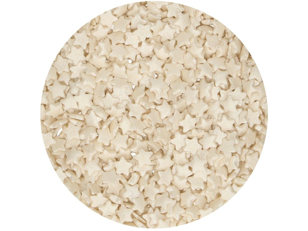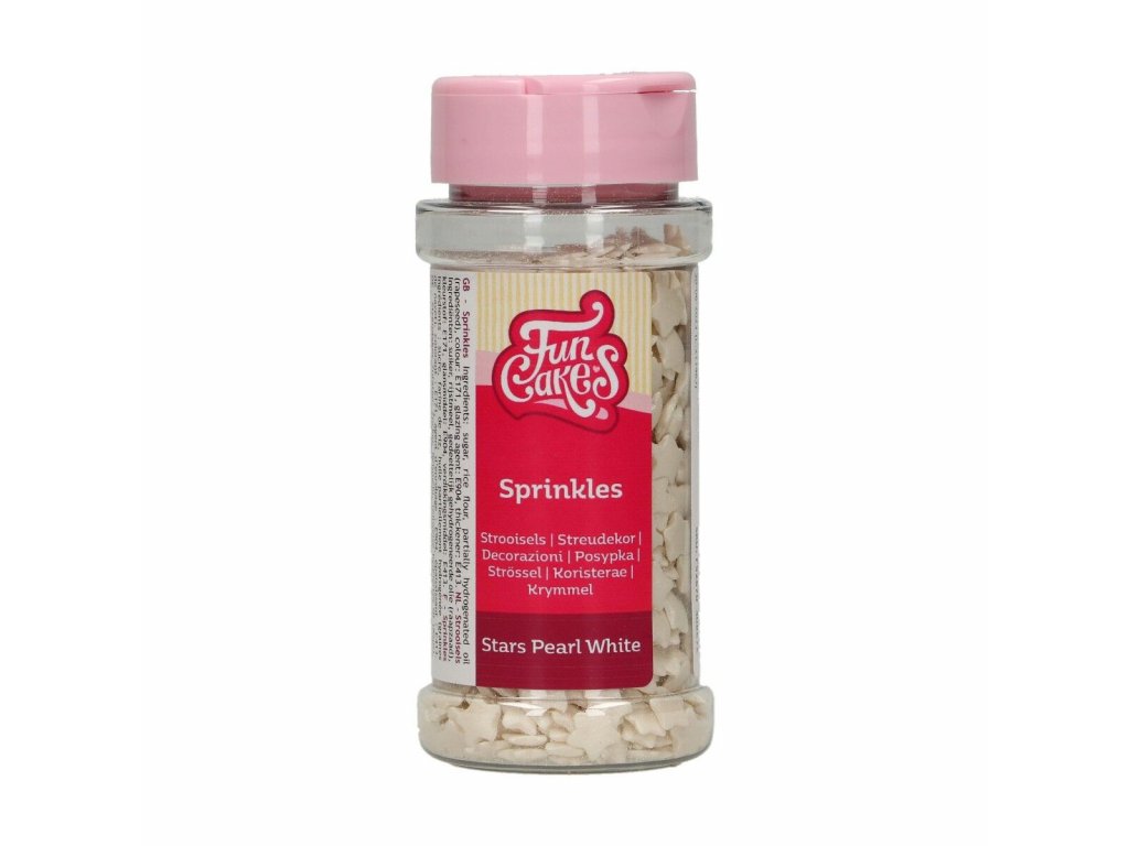 Dekoračný posyp vhodný na cupcake, medovníky, koláče a torty. #zloženie#FC POSYP HVIEZDY PERLEŤOVÉ BIELE 60G Cukrový jedlý posyp. Zloženie: cukor, ryžová múka, čiastočne hydrogenovaný olej (repkový), farbivo: E171, povlaková látka: E904, zahusťovadlo: E413, aróma. Distribútor: NewCakes BV, Bruynvisweg 3, 1531 AX, Wormer, Holandsko. Návod na použitie / dávkovanie: Na zdobenie koláčov, zákuskov a tort.. . Skladovanie: Teplota: min. 15.0°C, max. 20.0°C. Skladujte v suchu. Identifikácia výrobnej dávky: viď obal. Minimálna trvanlivosť do: viď obal. Hmotnosť: 60 g. Výživové údaje na 100 g: Energia 1774 kJ/419 kcal. Tuky 4,3 g; z toho nasýtené mastné kyseliny 0,8 g. Sacharidy 94 g; z toho cukry 88 g. Vláknina <0,5 g. Bielkoviny 0,6 g. Soľ <0,01 g.#zloženie#
