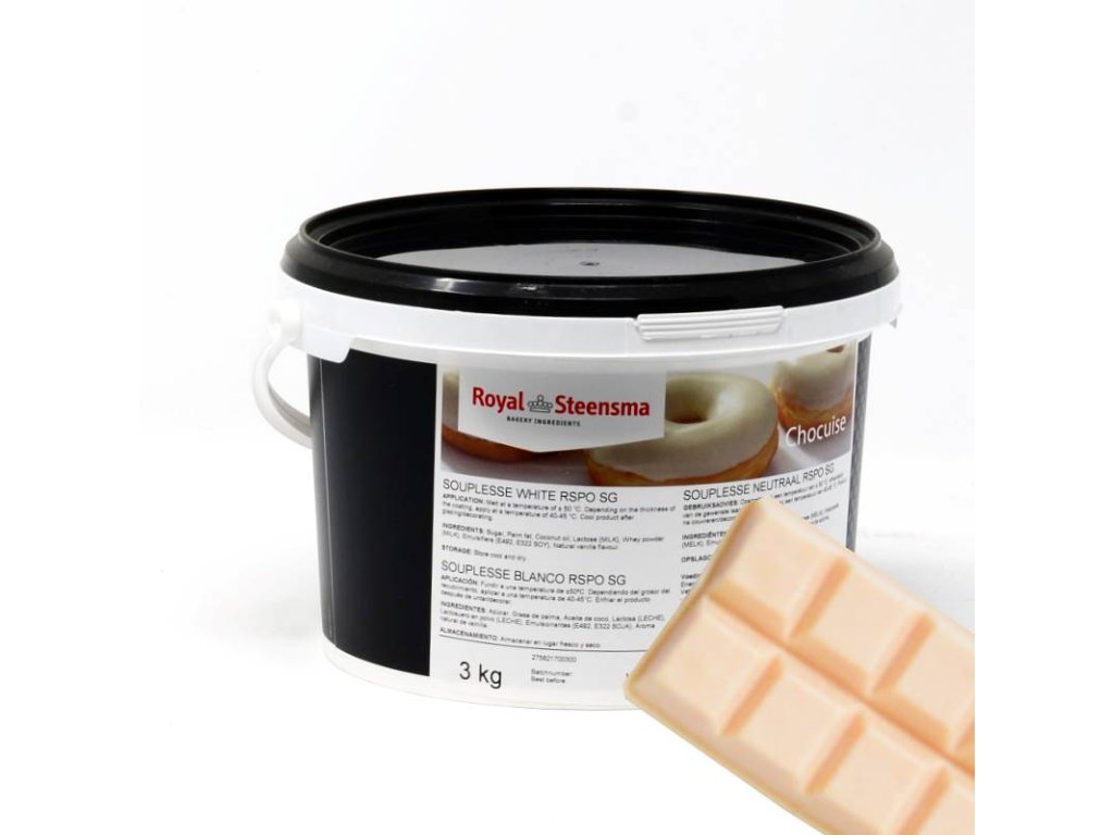 Glazúra s príchuťou bielej čokolády. Zloženie: Cukor, rastlinný olej (palmový olej), rastlinný olej (kokosový), LAKTÓZA, SUŠENÁ