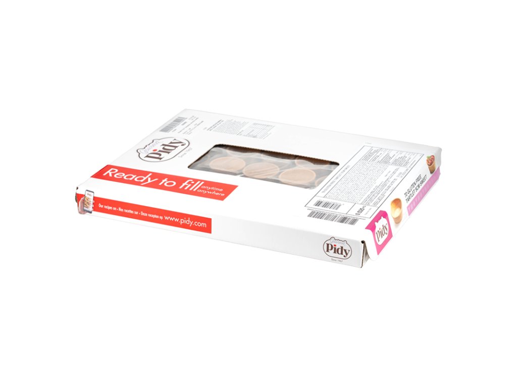 Gluten free Tartaletka okrúhla svetlá - blister - pr.5 cm; 70 ks. Zloženie: Zemiakový škrob; MASLOVÝ tuk (farbivo: E160a) (20%); cukor; kukuričný škrob; ryžový škrob; VAJCIA; voda; sušené VAJEČNÉ bielko; ryžová múka; dextróza; soľ; karamelizovaný cukor; zahusťovadlo: E461, E412; kypriaca látka: E450, E500; emulgátor: E475, E471; inulín. Môže obsahovať: SÓJOVÉ ZRNÁ A VÝROBKY Z NICH, ORECHY A VÝROBKY Z NICH, HORČICA A VÝROBKY Z NEJ. Alergény sú v zložení ZVÝRAZNENÉ. Výrobca: Pidy Production SAS, ZI de la Rouge porte Avenue de Menin, F-59250 , HALLUIN, Francúzsko. Návod na použitie / dávkovanie: Podľa potreby / receptúry. Vhodná pre výrobu cukrárskych predjedál, naplniť krémom a priamo spotrebovať. Skladovanie: Špecifické podmienky: teplota:10 - 25°C. Skladovanie po otvorení: Špecifické podmienky: teplota:10 - 25°C. Identifikácia výrobnej dávky: . Minimálna trvanlivosť do: viď obal