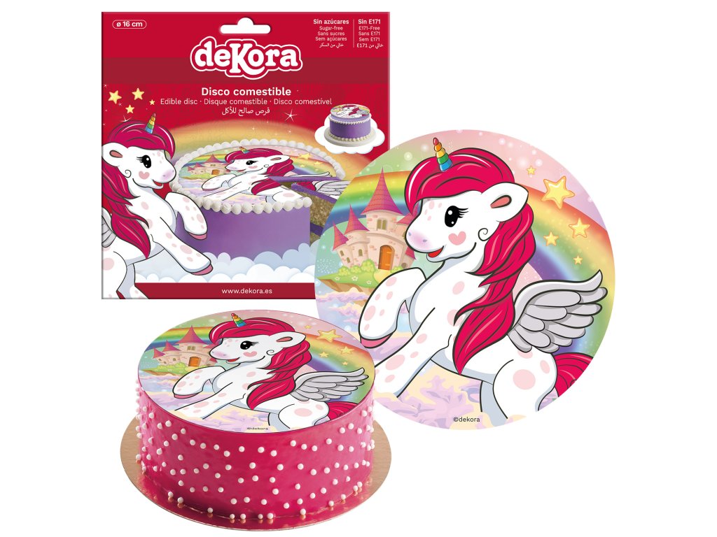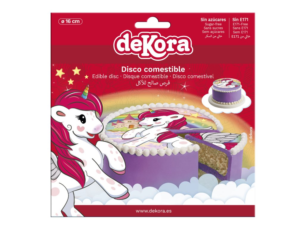 Jedlý obrázok Jednorožec - 1 kruh 16cm. Zloženie: škrob; sladidlo: E965; stabilizátor: E460i; zahusťovadlo: maltodextrín; zvlhčovadlo: E422; stabilizátory: E414, E466; emulgátor: E433; aróma; konzervačné látky: E330, E202; sladidlo: E955; emulgátor: E322 SÓJOVÝ lecitín; farbivá: E133, E151, E155, E162; extrakt z požltu farbiarskeho. Alergény sú v zložení ZVÝRAZNENÉ. Distribútor: Dekora Innova, S.A.U., Buzón 95, 03114 Alicante, Španielsko. Návod na použitie / dávkovanie: . V cukrárstve. Skladovanie: Teplota: min. 22.0°C, max. 25.0°C. Relatívna vlhkosť vzduchu 45%%. Identifikácia výrobnej dávky: viď obal. Minimálna trvanlivosť do: viď obal.
