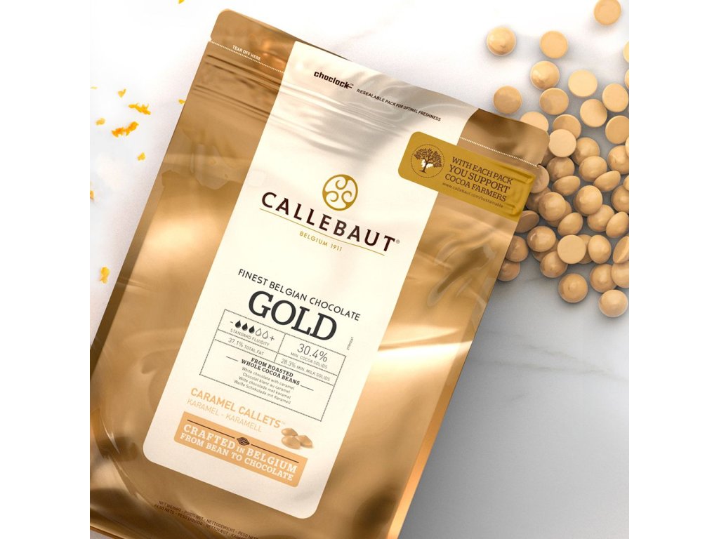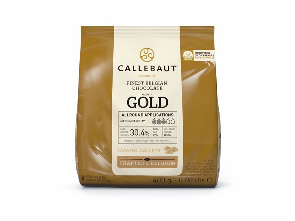 Belgická čokoláda Callebaut Gold ponúka dokonalú karamelovo-kakaovú chuť s s bohatými smotanovými tónmi a vzrušujúcim nádychom soli. Vhodná pre cukrársku a cukrovinkársku výrobu. Perfektná na bonbóny, polevy a ďalšie dezerty. Má ideálnu viskozitu, je vhodná pre prípravu praliniek, ozdôb a horúcej čokolády. Obsah kakaa 30,4%.