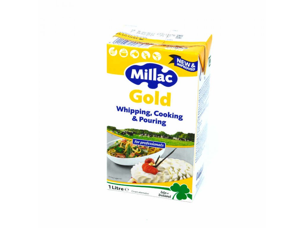 KRÉM MILLAC GOLD NESLADENÝ 1 L Tekutý krém na šľahanie a varenie (v kartóne 12 x 1 l). Zloženie: CMAR, úplne hydrogenovaný rastlinný olej (palmový), SMOTANA (6%), rastlinný olej (palmový olej), SUŠENÝ CMAR, Emulgátor - E472b Estery mono- a diglyceridov mastných kyselín s kyselinou mliečnou, Emulgátor - E475 Estery polyglycerolu mastných kyselín, Emulgátor - E435 Polyoxyetylénsorbitanmonostearát (polysorbát 60), Emulgátor - E471 Mono- a diglyceridy mastných kyselín, Emulgátor - E433 Polyoxyetylénsorbitanmonooleát (polysorbát 80), Stabilizátor - E410 Karobová guma, Stabilizátor – E407 Karagénan, Soľ, prírodná aróma (obsahuje MLIEKO), Farbivo - E160a Betakarotén. Alergény sú v zložení ZVÝRAZNENÉ. Distribútor: Lakeland Dairy sales Limited, Killeshandra, Co. Cavan H12 V273,Ireland. Návod na použitie / dávkovanie: podľa potreby/receptúry. Pred šľahaním nechať produkt odležať v chladničke po dobu 12 hodín.. Vhodný do šľahačkových náplní a smotanových krémov v cukrárskej výrobe, na výrobu zmrzliny. Možno ho použiť ako alternatívu smotany na varenie do omáčok a polievok v gastronómii. Produkt je sterilizovaný UHT ohrevom, asepticky balený. Dodržaná je obchodná sterilita - výrobok neobsahuje životaschopné mikroorganizmy, ktoré by sa mohli za podmienok uvádzania na trh pomnožiť a vyvolať ochorenie ľudí.. Skladovanie: Teplota: min. 2.0°C, max. 20.0°C. Relatívna vlhkosť vzduchu 65.0%. Skladovanie po otvorení: Teplota: min. 2.0°C, max. 8.0°C. Identifikácia výrobnej dávky: viď obal. Minimálna trvanlivosť do: viď obal. Hmotnosť: 1 kg.