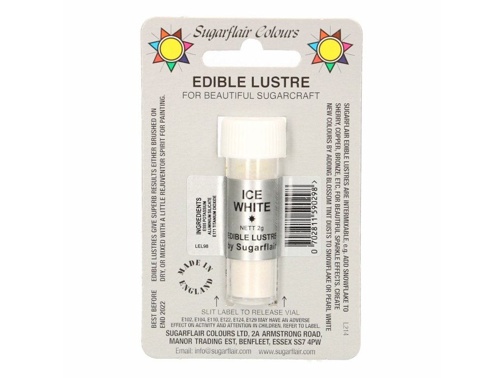 Návod na použitie / dávkovanie: Prachovú farbu aplikujte pomocou štetca v požadovanom množstve na torty, fondánové dekorácie a cupcakes. Farbu môžete zmiešať s trochou číreho alkoholu, vznikne tak tekutá farba na maľovanie.. . Skladovanie: Uchovávajte v uzavretých nádobách na suchom mieste. Identifikácia výrobnej dávky: viď obal. Minimálna trvanlivosť do: viď obal. Hmotnosť: 2 g. #zloženie#PRACHOVÁ FARBA SF 2G - ICE WHITE (BIELA) Farba do potravín. Zloženie: farebný nosič: E555, farbivo: E171. Distribútor: NewCakes BV, Bruynvisweg 3, 1531 AX, Wormer, Holandsko. Návod na použitie / dávkovanie: Prachovú farbu aplikujte pomocou štetca v požadovanom množstve na torty, fondánové dekorácie a cupcakes. Farbu môžete zmiešať s trochou číreho alkoholu, vznikne tak tekutá farba na maľovanie.. . Skladovanie: Uchovávajte v uzavretých nádobách na suchom mieste. Identifikácia výrobnej dávky: viď obal. Minimálna trvanlivosť do: viď obal. Hmotnosť: 2 g. #zloženie#