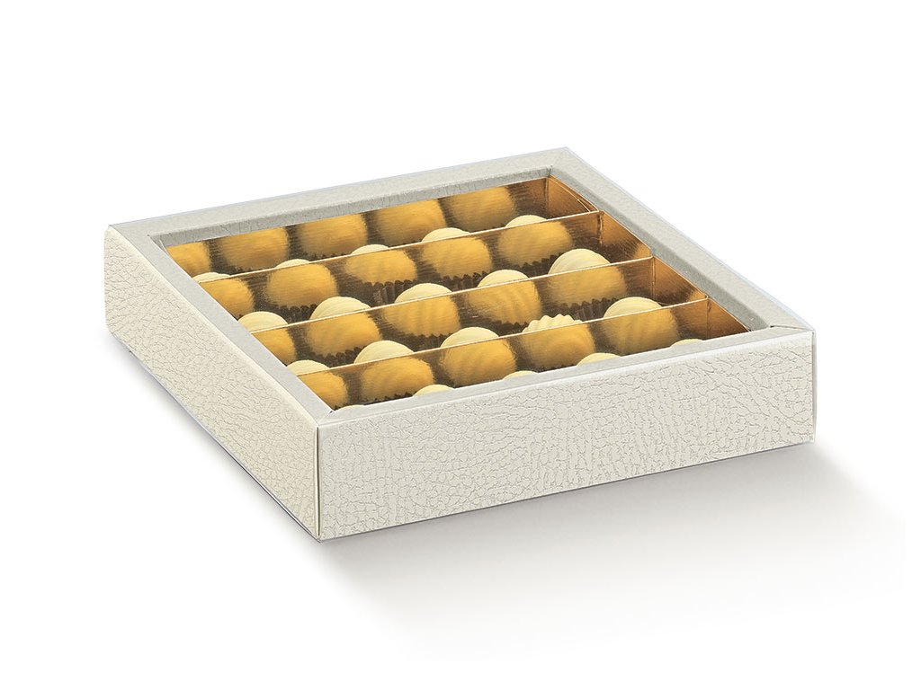 Štýlová krabička v jemnom béžovom prevedení so štruktúrovaným povrchom je určená na balenie praliniek, truflí a iných ručne vyrábaných cukroviniek. Jej neutrálny, elegantný vzhľad sa hodí na každú príležitosť – od darčekového balenia cez predajné vitríny až po svadobné či firemné využitie.