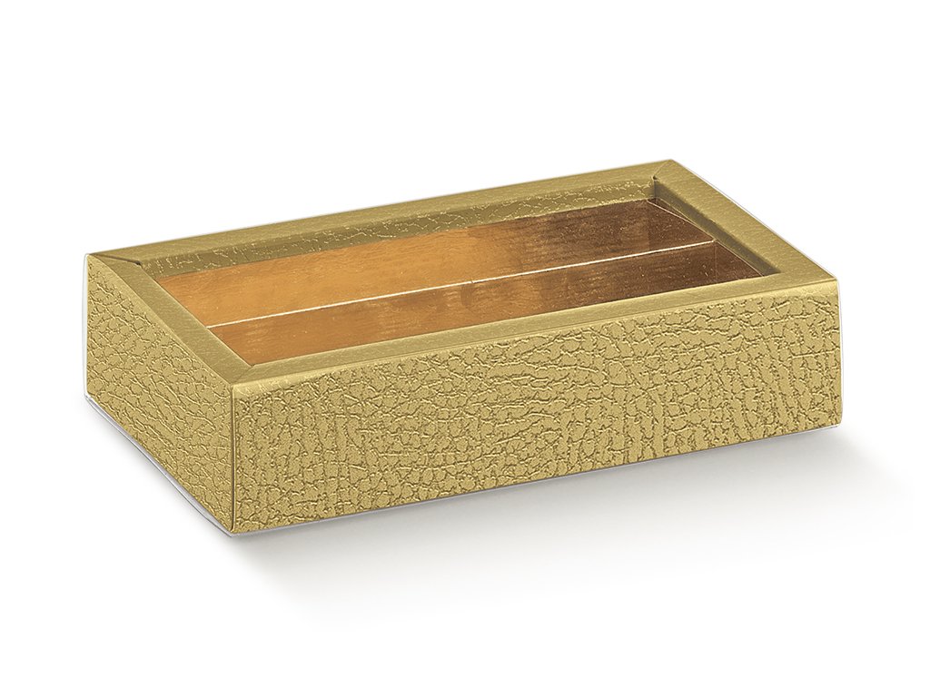 Zlatá krabička na pralinky s jemnou štruktúrou povrchu je skvelou voľbou pre každého, kto chce svoje ručne vyrábané sladkosti prezentovať s vkusom. Vďaka priehľadnému viečku umožňuje krabička krásne vyniknúť obsahu bez potreby otvárania – ideálna na darčekové balenie, predaj aj prezentáciu produktov.