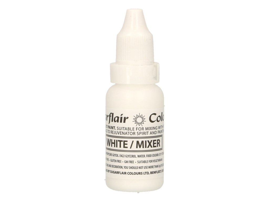 Farba do potravín. Zloženie: zvlhčovadlo: E422; voda; zahusťovadlo: E551; farbivo: E170. Distribútor: NewCakes BV, Bruynvisweg 3, 1531 AX, Wormer, Holandsko. Návod na použitie / dávkovanie: Zosvetľuje cukrovú pastu a zmierňujú nežiaduci žltý tón maslového krému i čokolády. Odporúčané dávkovanie 3g farbiva na 1 kg hmoty. Skladovanie: Uchovávajte v uzavretých nádobách na suchom mieste. Identifikácia výrobnej dávky: . Minimálna trvanlivosť do: viď obal#zloženie#