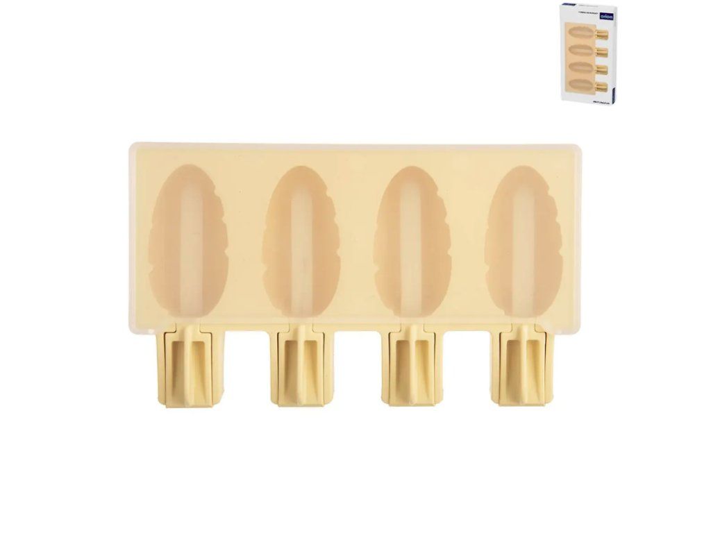 #zloženie#Silikónová forma na nanuky Vajce O. Silikónová forma na nanuky Vajce. Žltá silikónová forma so 4 priehlbinami a 24 kusmi drevených paličiek. Jednotlivé formičky majú veľkosť 6,5x3,5 cm. Forma má rozmery: 20x11,5x2,6 cm.. Distribútor: Orion trade s.r.o., Pezinská cesta 30, 903 01 Senec, Slovensko. Návod na použitie / dávkovanie: Podľa potreby. Odolné teplotám od -20 °C do +120 °C. Vhodná do umývačky riadu, MVR, chladničky, mrazničky aj rúry. v cukrárstve. Identifikácia výrobnej dávky: viď obal. Hmotnosť: . Materiál: silikón.#zloženie#