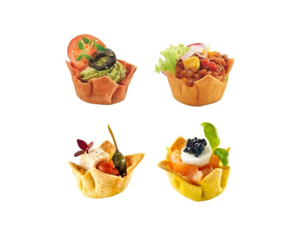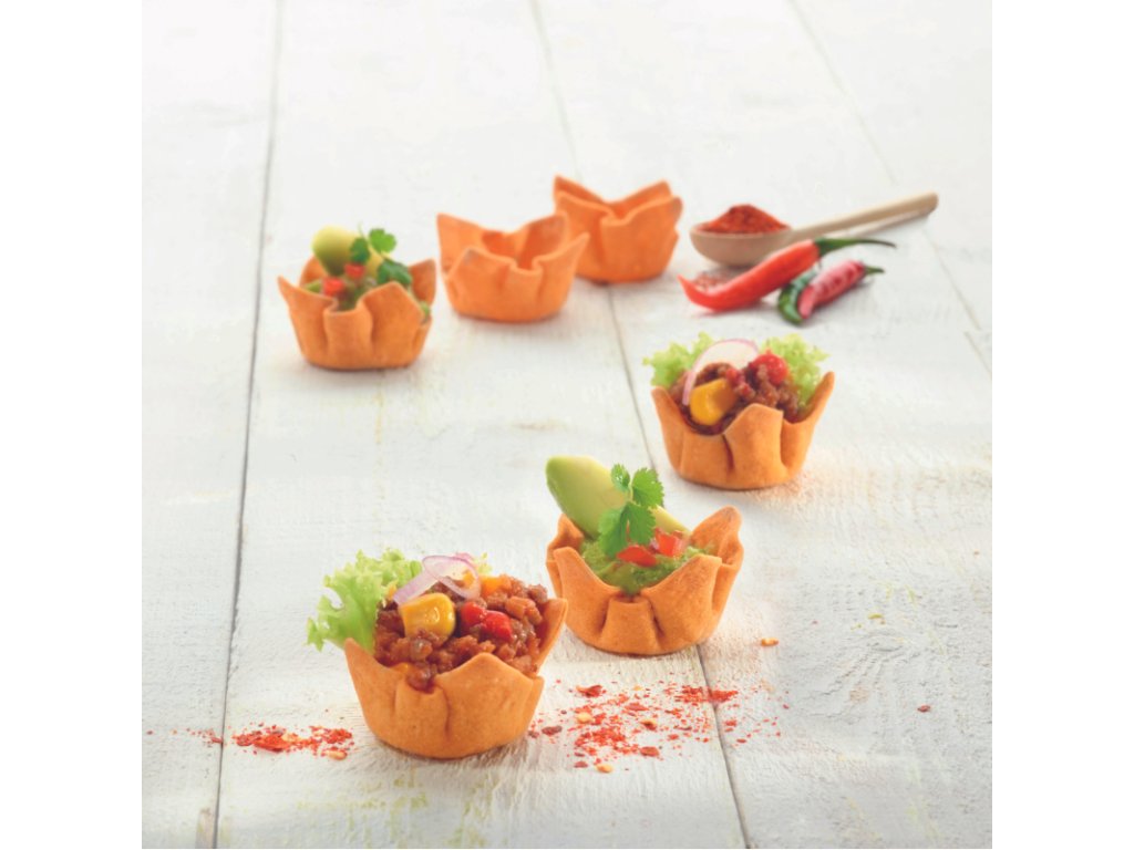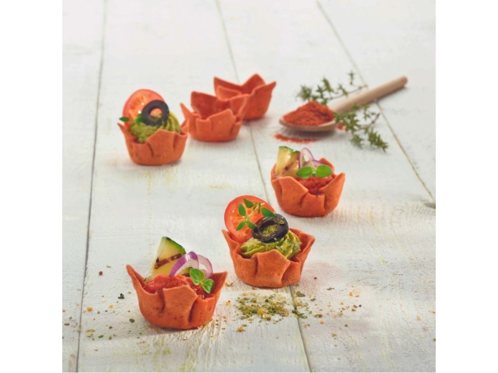 Pikantný tapas mix košíčkov prináša do vášho podávania pestrosť chutí aj vizuálnu atraktivitu. Balenie obsahuje štyri rôzne druhy košíčkov, každý ochutený jedinečnou kombináciou korenín, byliniek a sušených rajčín. Ich priemer 32 mm je ideálny pre tapas, jednohubky, kanapky a cateringové prezentácie.