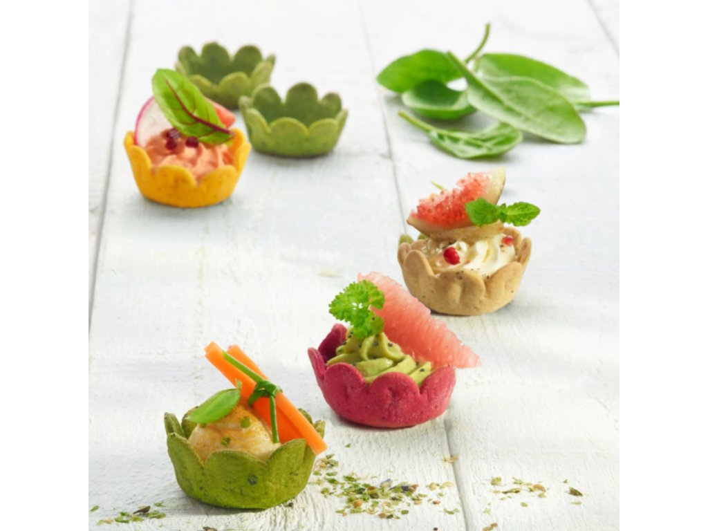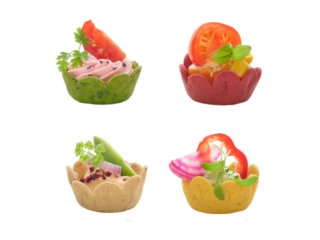 Zeleninový tapas mix je vizuálne atraktívna a chuťovo pestrá voľba pre každého, kto chce servírovať jednohubky s nápadom. Tieto kvetinovo tvarované košíčky s priemerom 40 mm sú vyrobené z kombinácie pšeničnej a kukuričnej múky a ochutené pravými zeleninovými práškami – špenátovým, mrkvovým, repovým, cibuľovým – doplnenými bylinkami ako pažítka, estragón a trebuľka.