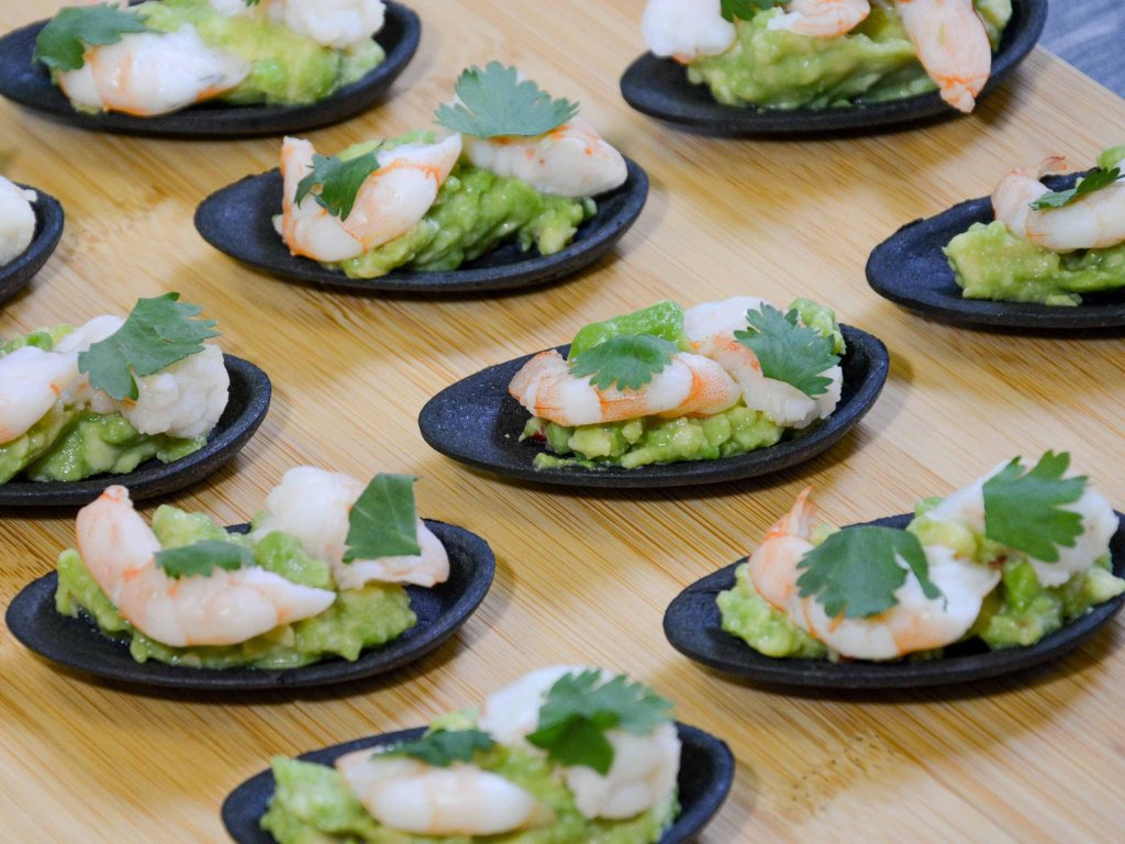 Tapas s čerstvo pripraveným guacame a šťavnatými krevetami.