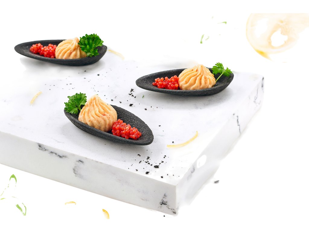 Čierna mušla sa výborne kombinuje so svetlými plnkami, vytvára kontrast, ktorý priťahuje pozornosť hostí. Je stabilná, krehká a odolná voči nasiaknutiu – čo z nej robí ideálny základ na cateringové použitie.